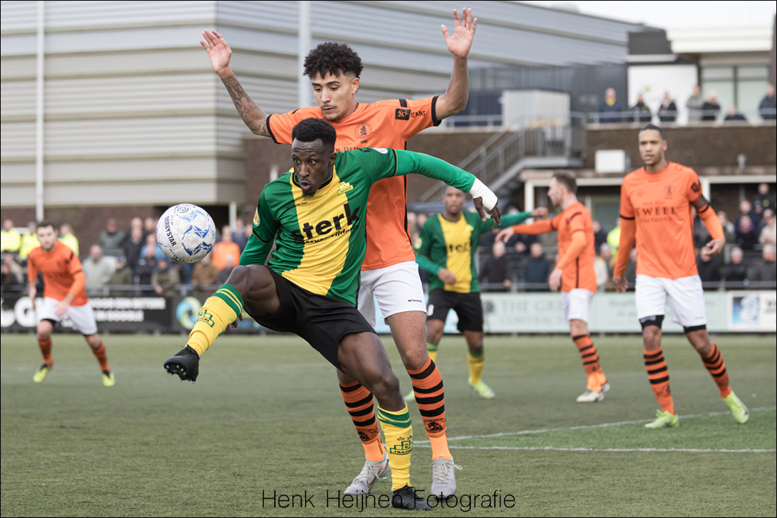 Opnieuw een kans als drie minuten voor de rust Sam Krant (ooit in de jeugd in groen-geel te bewonderen geweest) even Joshua Lo-Asioe niet in de gaten heeft als hij rustig aan de opbouw denkt te kunnen beginnen. Joshua Ontfutselt hem de bal en denkt op doelman Bouwman af te kunnen gaan. Maar de doelman is alert en heeft het gevaar tijdig onderkend en voor Joshua zijn draai richting goal heeft kunnen voltooien ligt de doelman al op zijn voeten en graait de bal weg.