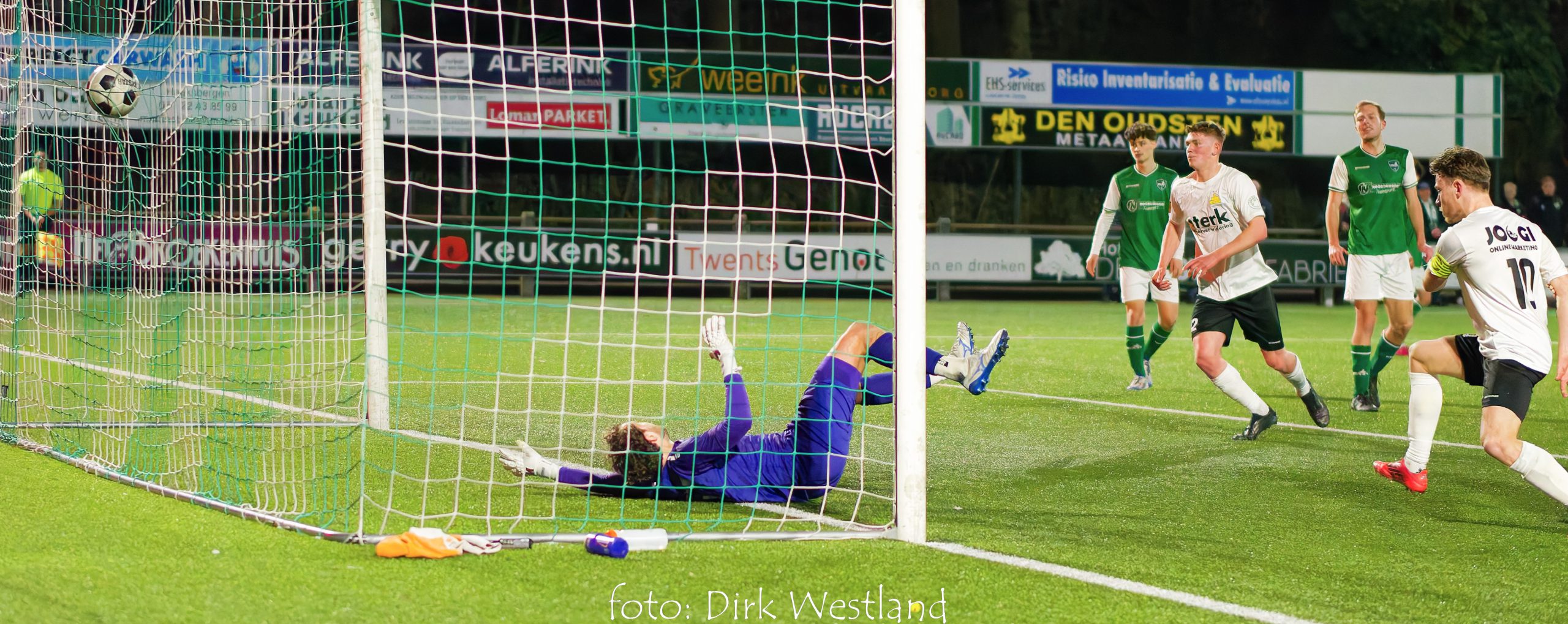 Een doorschietende bal komt voor de voeten van Tristen Kroeze die brutaal mee ten aanval is getrokken. Schuin voor de goal bedenkt hij zich niet en haalt hard uit. Helaas stond het vizier na al die maanden blessureleed nog niet helemaal op scherp en de bal gaat een metertje over de goal van Peterman richting vergetelheid. Ik had het hem wel gegund.