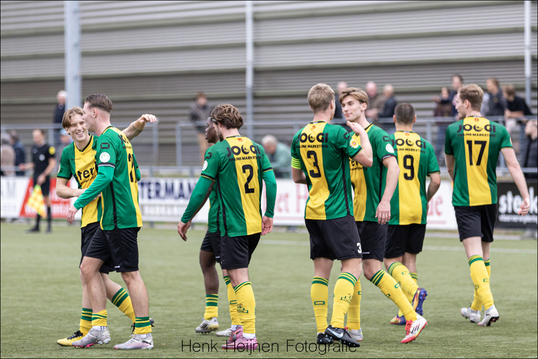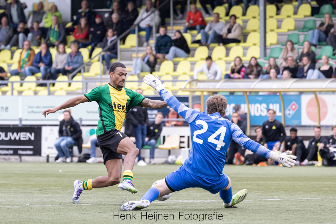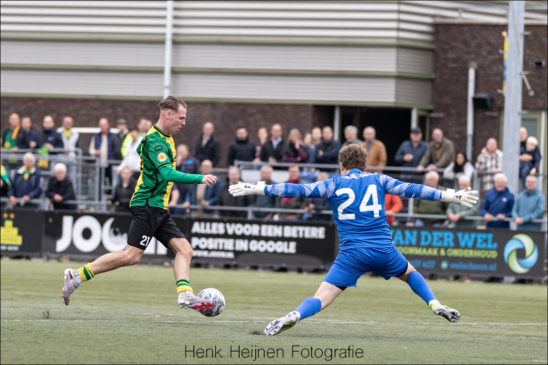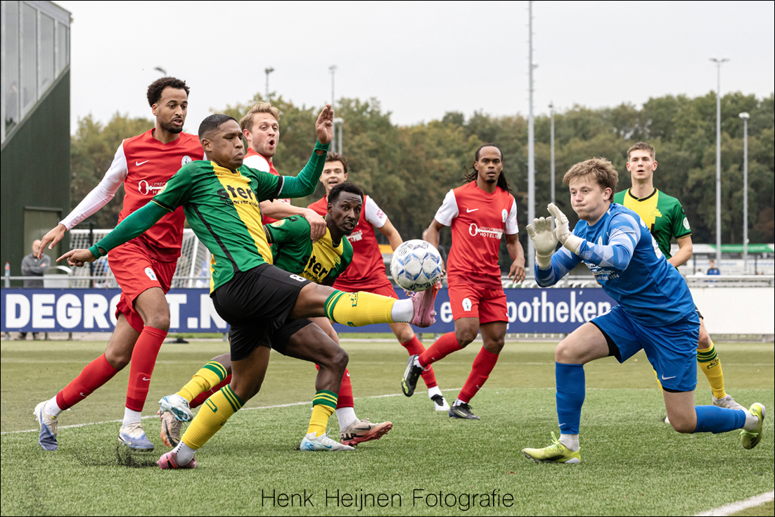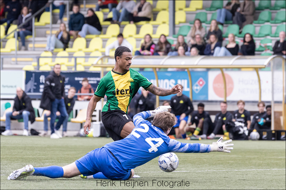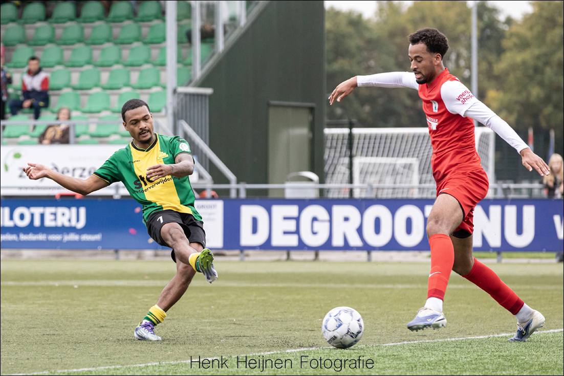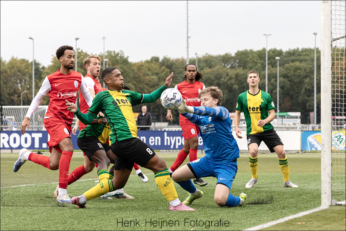 Je ziet de vertwijfeling bij de mannen van Jochem Twisker binnen sluipen. Shanon Carmelia kan de frustratie even niet helemaal de baas en vergrijpt zich wat aan Jaylon Moi Thuk Shung. Ook geel voor Carmelia, deze keer zonder meer terecht. De vrije trap wordt ingebracht en doelman Gerritsen bokst de bal naar veiliger oorden. Er vaart toch iets van ‘winning-mood’ in onze mannen.