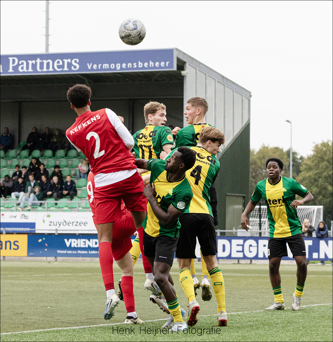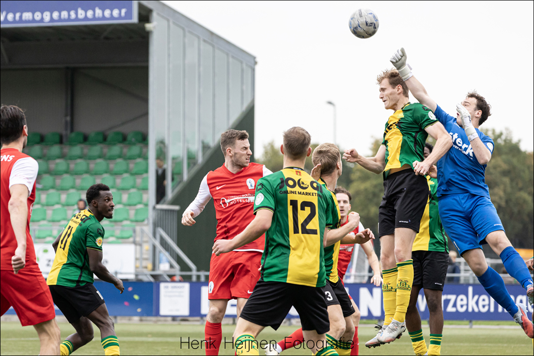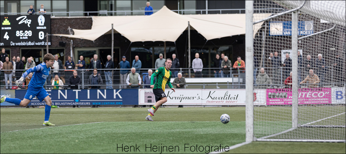 En meteen lijkt Hercules succes te hebben als een bal fraai met de hak wordt binnen gewerkt via de paal. Gelukkig constateerde de grensrechter dat de voorzet van achter de lijn werd gegeven. Nou zit ik er niet echt gunstig voor om dat te kunnen constateren, maar véél zal dat niet gescheeld hebben! Huizen komt gelukkig met de schrik vrij.