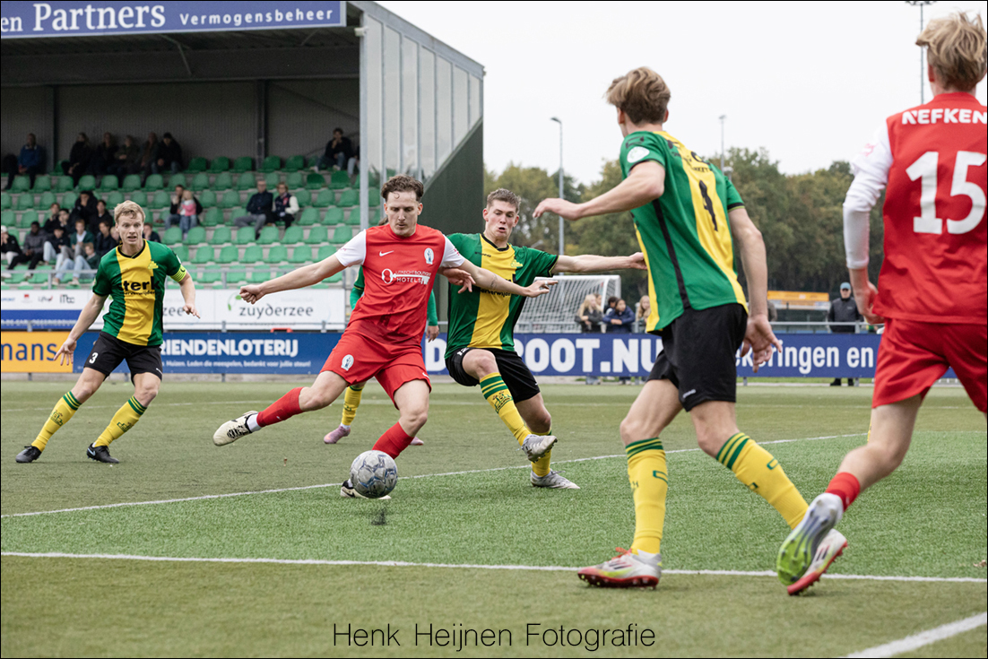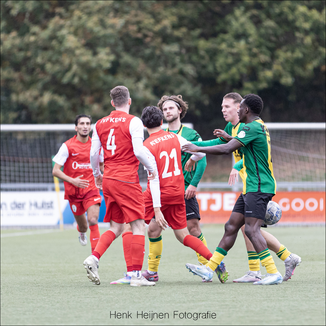 Nadat eerder Jeroen Lamme al een gele prent voorgeschoteld had gekregen van arbiter Daniël Drost, is nu ook Joshua Lo-Asioe de pineut. Een beetje op appelleren en op basis van de ‘kerm’ trekt onze arbiter van dienst het geel uit de borstzak. An sich geen slechte scheidsrechter, die Drost, maar wel wat inconsequent. Ik had bij opmerkelijk veel situaties het ‘doet-ie-het-of-doet-ie-het-niet’ gevoel. Een enorme beuk wordt simpel weggewuifd, terwijl dit onschuldige duel, waarbij de speler weliswaar wel wat geraakt wordt, meteen geel oplevert. Een wat onzekere factor in dit duel!