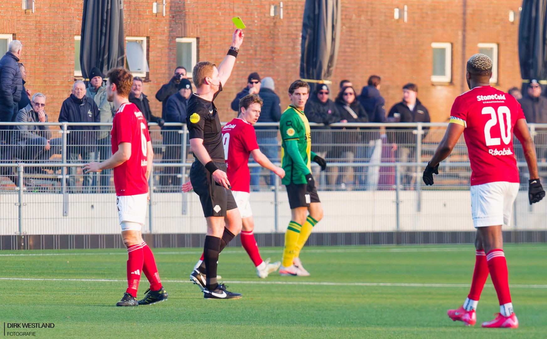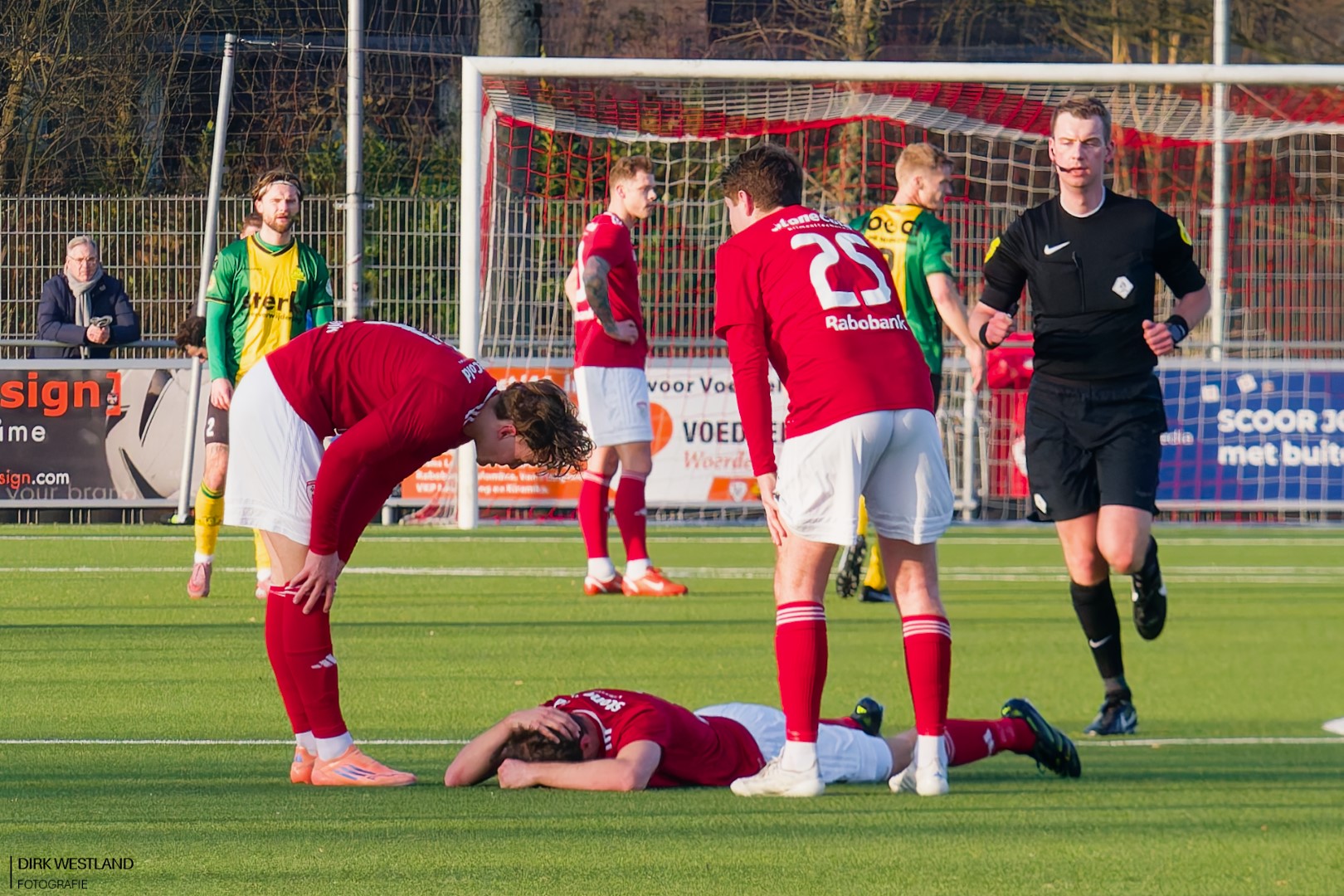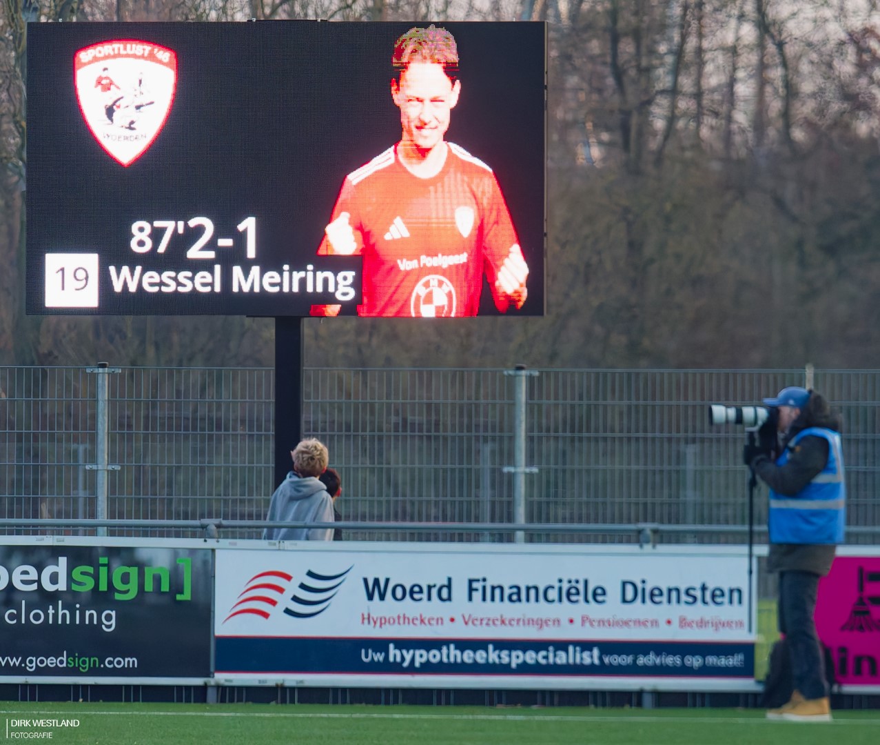 “Bal uit! Bal uit!” wordt er volop geroepen als Mitchell van der Veer op het middenveld neergaat met een kennelijke hoofdblessure. Opmerkelijk genoeg geeft het eigen Sportlust daar géén gehoor aan en voetbal lustig verder op jacht naar die gelijkmaker. Ook arbiter Martin Wever weigert af te fluiten en ook de grensrechter aan de tribunezijde lijkt niet aan te willen geven dat er iemand met een hoofdblessure op het ijskoude veld ligt te creperen. Van der Veer moet eerst opgelapt worden voor hij verder kan. Hij lijkt er vooralsnog een pijnlijke nek aan over te hebben gehouden als hij naar de kant wordt geholpen door de Woerdense verzorging. Een opmerkelijk momentje.