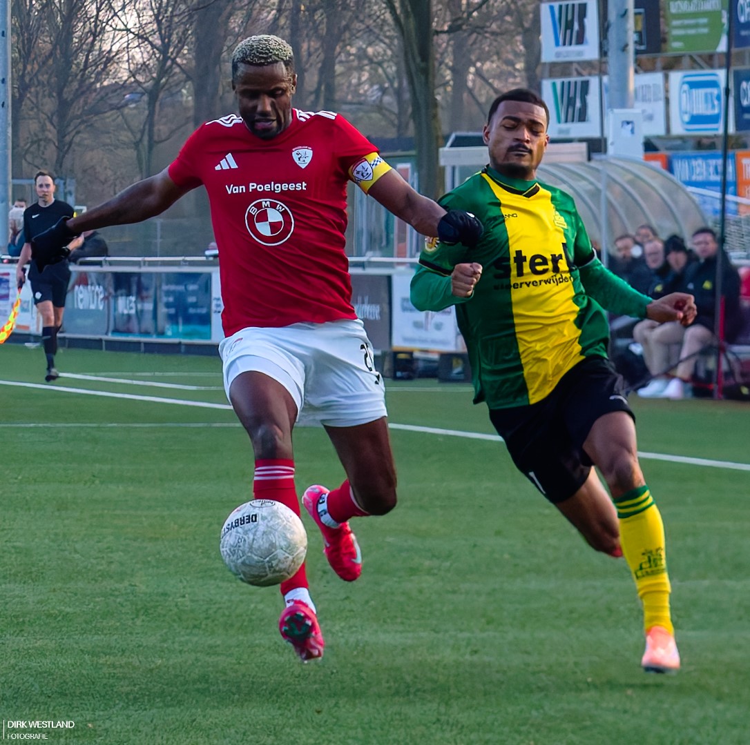 Of het frustratie was of niet, maar zes minuten voor rust haalt Kjeld van den Hoek van een meter of dertig verwoestend uit! Als een streep spat de bal richting Pabon, die gelukkig op exact de juiste plek staat om deze pegel in ontvangst te nemen. Met deze kou nog lastig zat, maar hij weet de klus te klaren. Dat geldt even later niet voor Artuur Zutterman die mistast waardoor Kesly den Haag ineens vrij baan heeft. Opnieuw is daar Olivier Pabon die de heldenrol voor zich opeist en ten koste van ene corner erger weet te voorkomen. Die wordt lang en ver voor gebracht en lijkt al meteen kansloos. Maar dan is daar vanaf de andere kant opnieuw een inzet die deze keer door Jeroen Lamme tot corner moet worden gewerkt. Huizen buigt, maar wil vooralsnog niet barsten.
