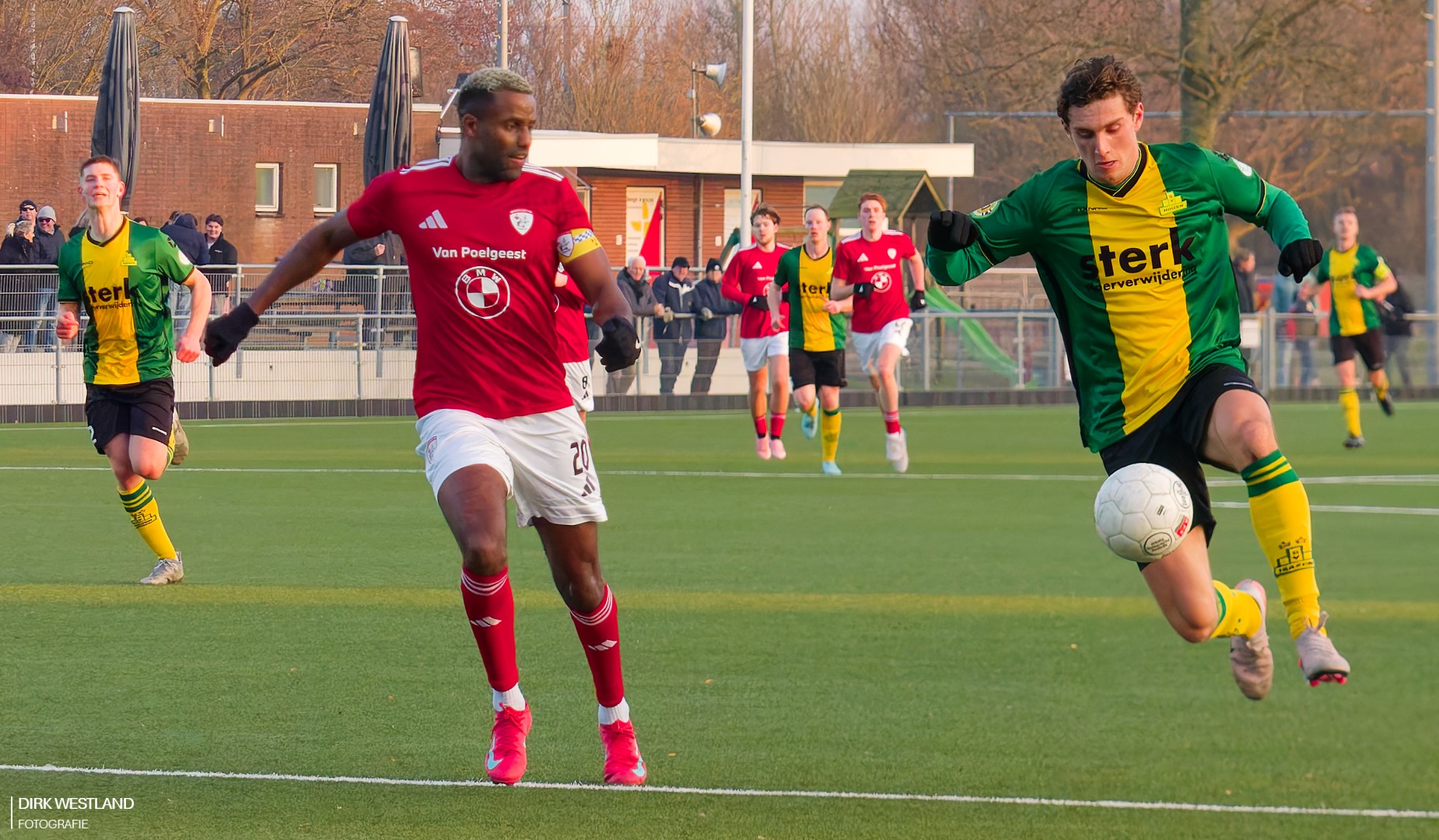 De druk houdt aan van Sportlust. Nu is het Timo Lutters weer die gevaarlijk opstoomt. Jaylon heeft echter ene prima sprint in huis en weet zijn verdedigende actie met succes af te ronden. Wel weer een corner…