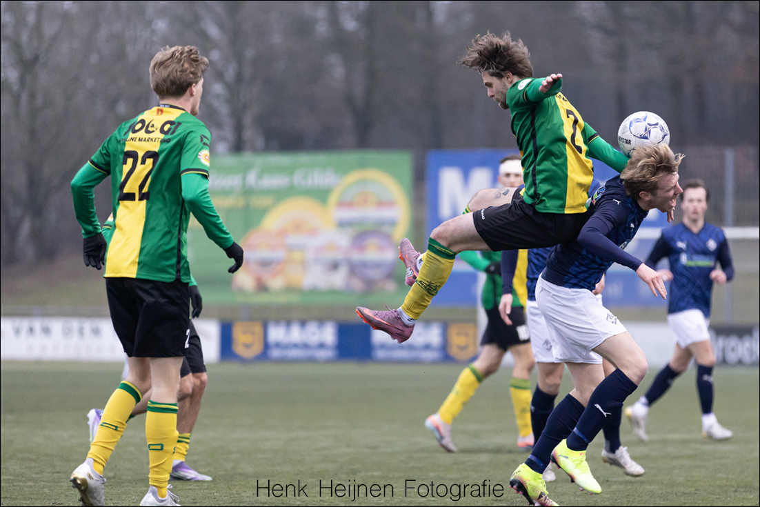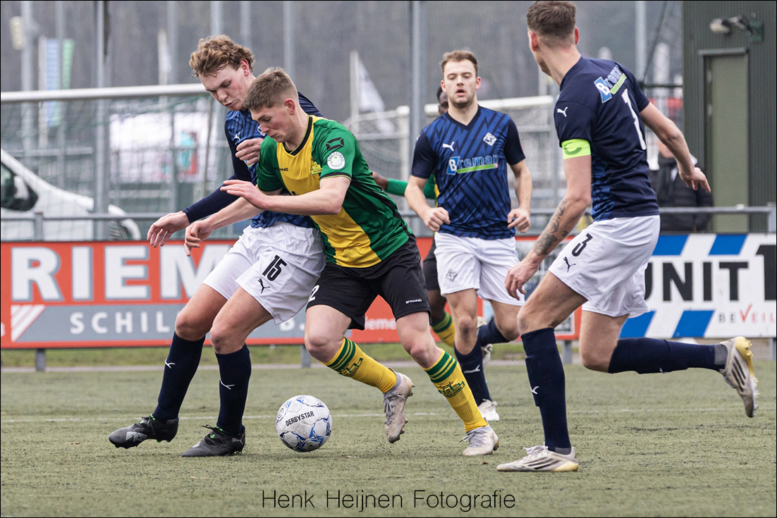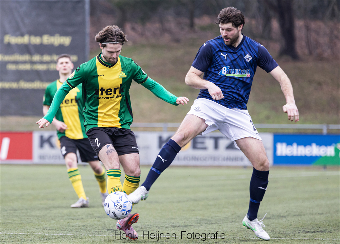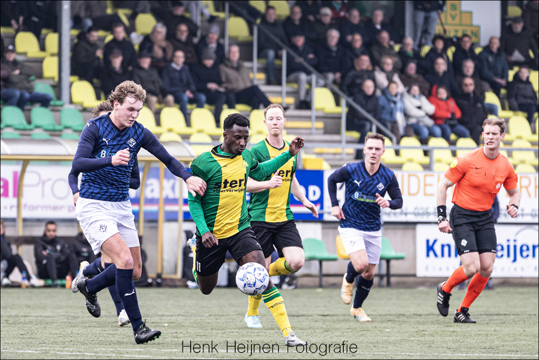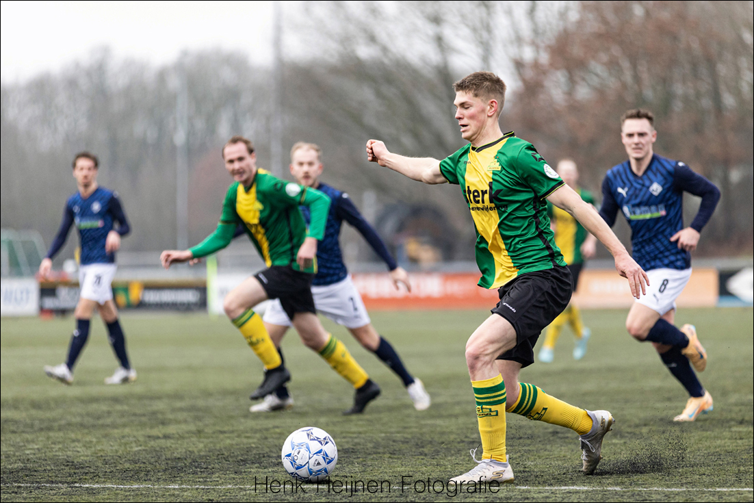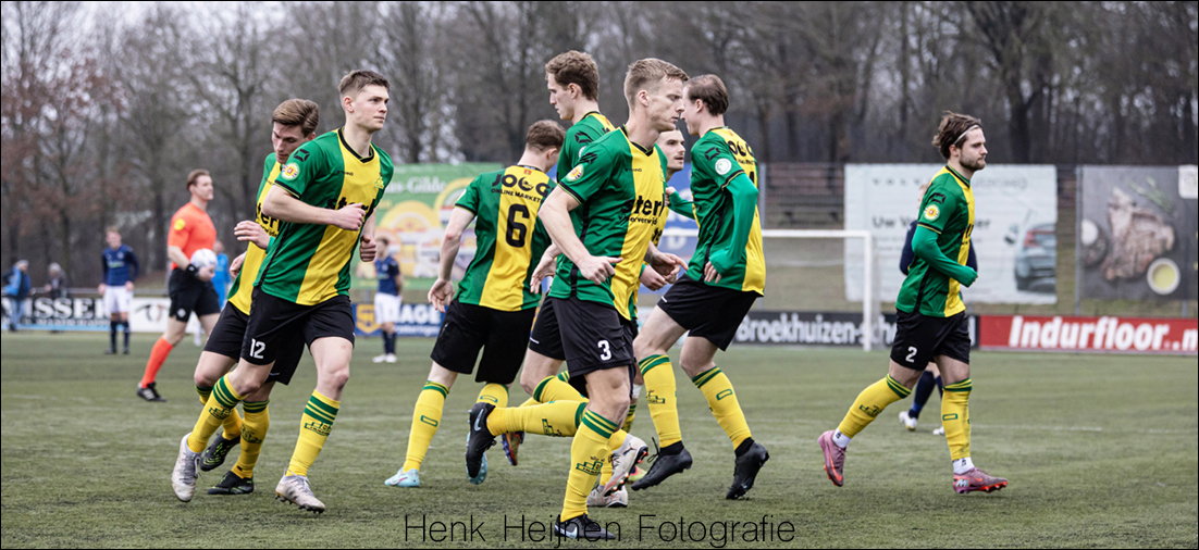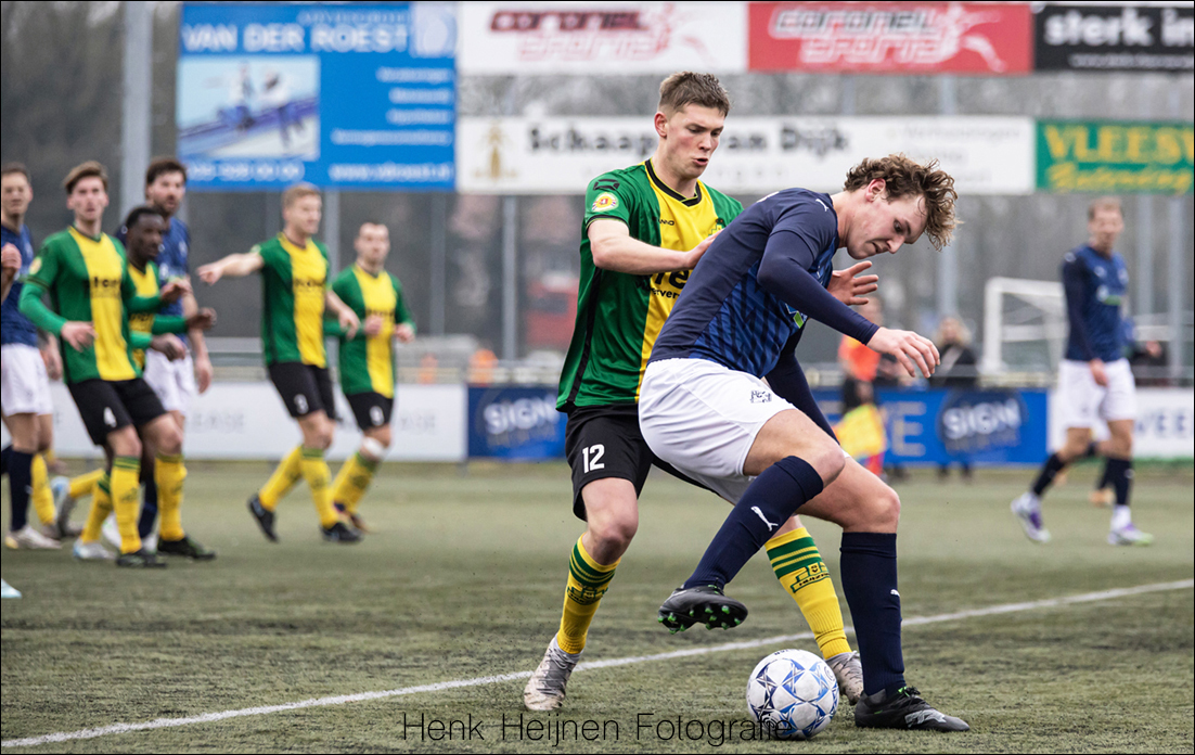 Wie hoopte dat Huizen een tandje bij zou gaan zetten en de rug zou rechten, die kwam toch wel bedrogen van een koude kermis thuis. Door alle ijver en werklust (dat kon ook onze mannen zeker niet ontzegd worden) is het een rommelige pot voetbal geworden. Er worden veel duels uitgevochten en het is meer transpiratie dan inspiratie wat we voorgeschoteld krijgen. Een kopbal van Marc Magan wordt onder de lat weggevangen door Olivier Pabon, een harde pegel van Jasper Tuinman eindigt op het lichaam van Jeroen Lamme, Pleijsier tipt een voorzet rakelings over onze goal, Pabon redt fraai en sterk op een inzet van Tuinman in de korte hoek. Huizen wankelt en strompelt richting rust. Het is aan de genade van Genemuiden overgeleverd. Als de mannen van Klein een tikkeltje scherper waren geweest, dan had een nulletje of drie, vier, zeker niet vreemd geweest. Wellicht tot eigen verbazing blijft de schade beperkt tot die ene treffer die maar een schamele afspiegeling is van de krachtsverhoudingen op het veld.