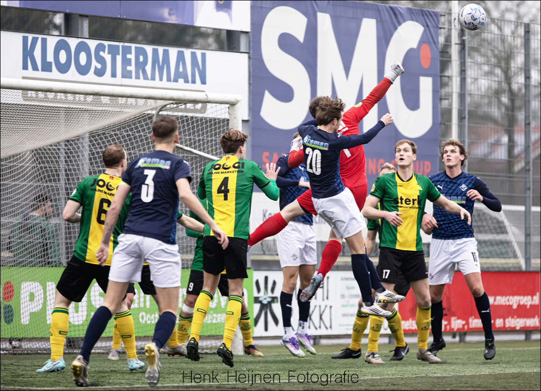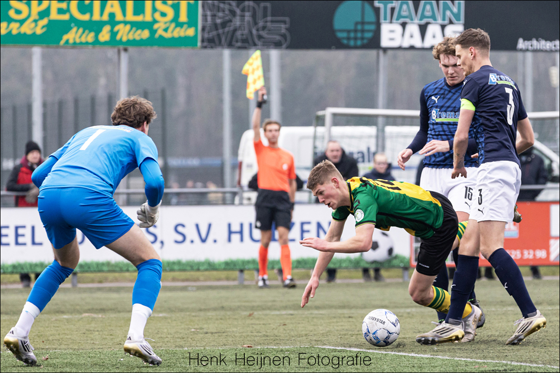 Even lijkt Huizen zich dan wat te herpakken als een fraaie combinatie opgezet wordt door Ahmed al Mahdi en Jaylon. De bal komt voor en de mee opgekomen Artuur Zutterman ziet zijn inzet gestuit in de muur die Genemuiden soepeltjes voor doelman Hidde Streutker heeft opgetrokken. Diezelfde Zutterman versiert even later een corner die door Sergio Kozjak wat te scherp bij de eerste paal wordt ingebracht. De afspraak zal zijn geweest dat daar iemand van Huizen op zou moeten duiken, maar het waren louter donkerblauwe kousen die daar de wacht hielden.