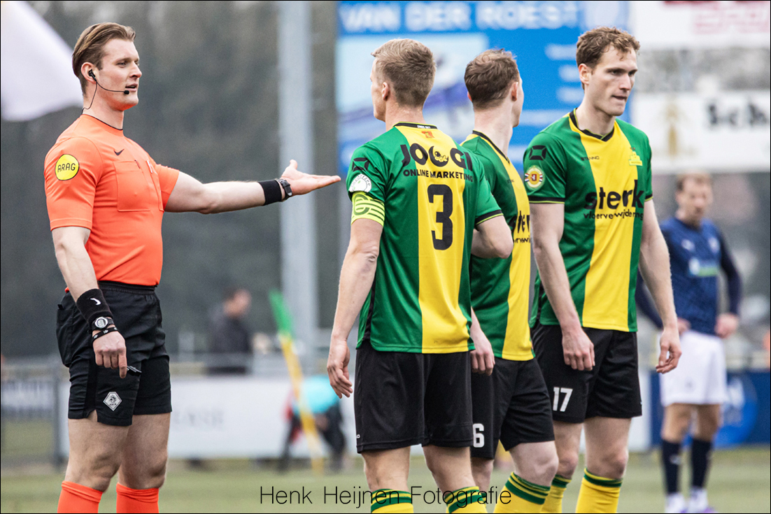 Ook Dailey Groenewegen ziet nog geel als hij wat al te voortvarend een aanval van Genemuiden onderbreekt. Even twijfel over doorgaan of stoppen als Marc Magan met krampverschijnselen neergaat. Twijfel is nooit goed en dus loopt het momentum uit de aanval en wordt Magan pas enkele minuten later vervangen als Arnold Klein een drievoudige wissel toepast. Rutger Etten komt voor de kramperige Magan, Nick Buitink vervangt Jasper Tuinman en Martijn Eenkhoorn lost Niels Grevink af.