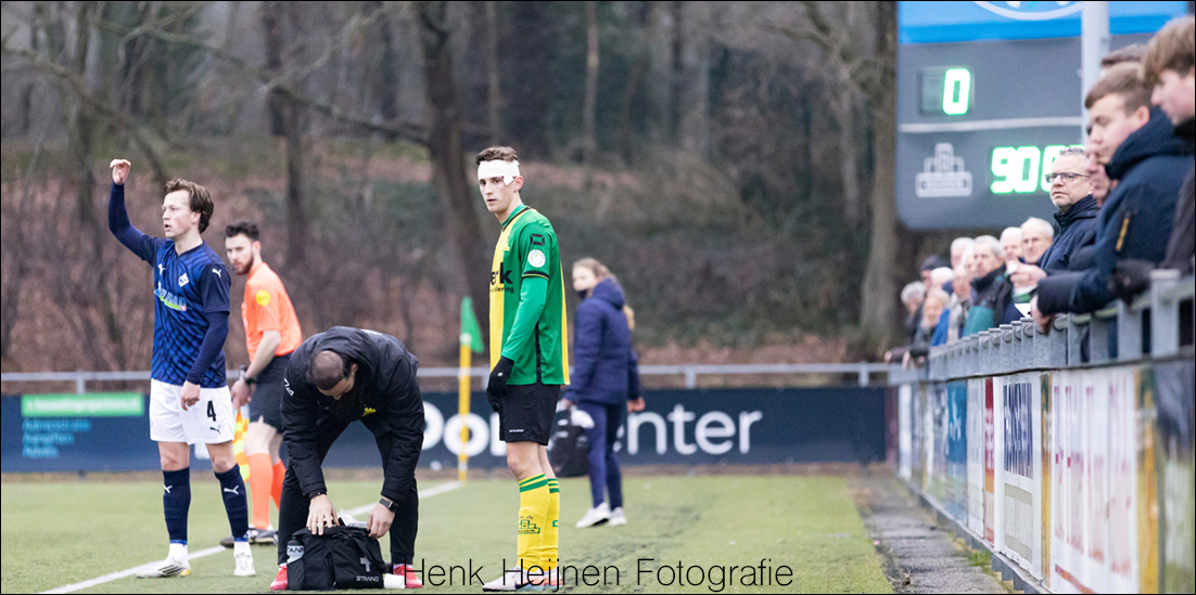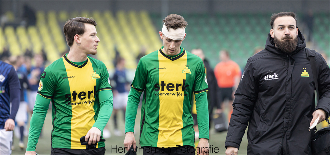 Huizen ploetert verder, moed der wanhoop, denk ik. Het moet ruimtes weggeven en daarmee lijkt de 0 – 3 eerder voor de hand liggen dan de aansluitingstreffer. Een bal voorlangs nog, Thomas Kamstra en Dani Vivié moeten nog voor wat aanvallende impulsen zien te zorgen als ze Tijmen Bakker en Ahmed Al Mahdi komen vervangen. Even schrik want Lars van Huisstede kopt tegen Guido Bakker aan en beiden gaan neer. Lars krijgt een tulbandje van verband aangemeten en dan kunnen beiden gelukkig verder. Maar de wedstrijd zit er op. Voor de vorm wordt er nog wat heen en weer gehold in de extra tijd die arbiter Groothuismink plichtmatig nog aan de wedstrijd toevoegt en dan zit deze lijdensweg voor Huizen er op. Een uitermate teleurstellende nederlaag tegen een tegenstander waar een resultaat toch zeker tot de mogelijkheden had moeten behoren, maar dat er deze wedstrijd eigenlijk geen moment in heeft gezeten…