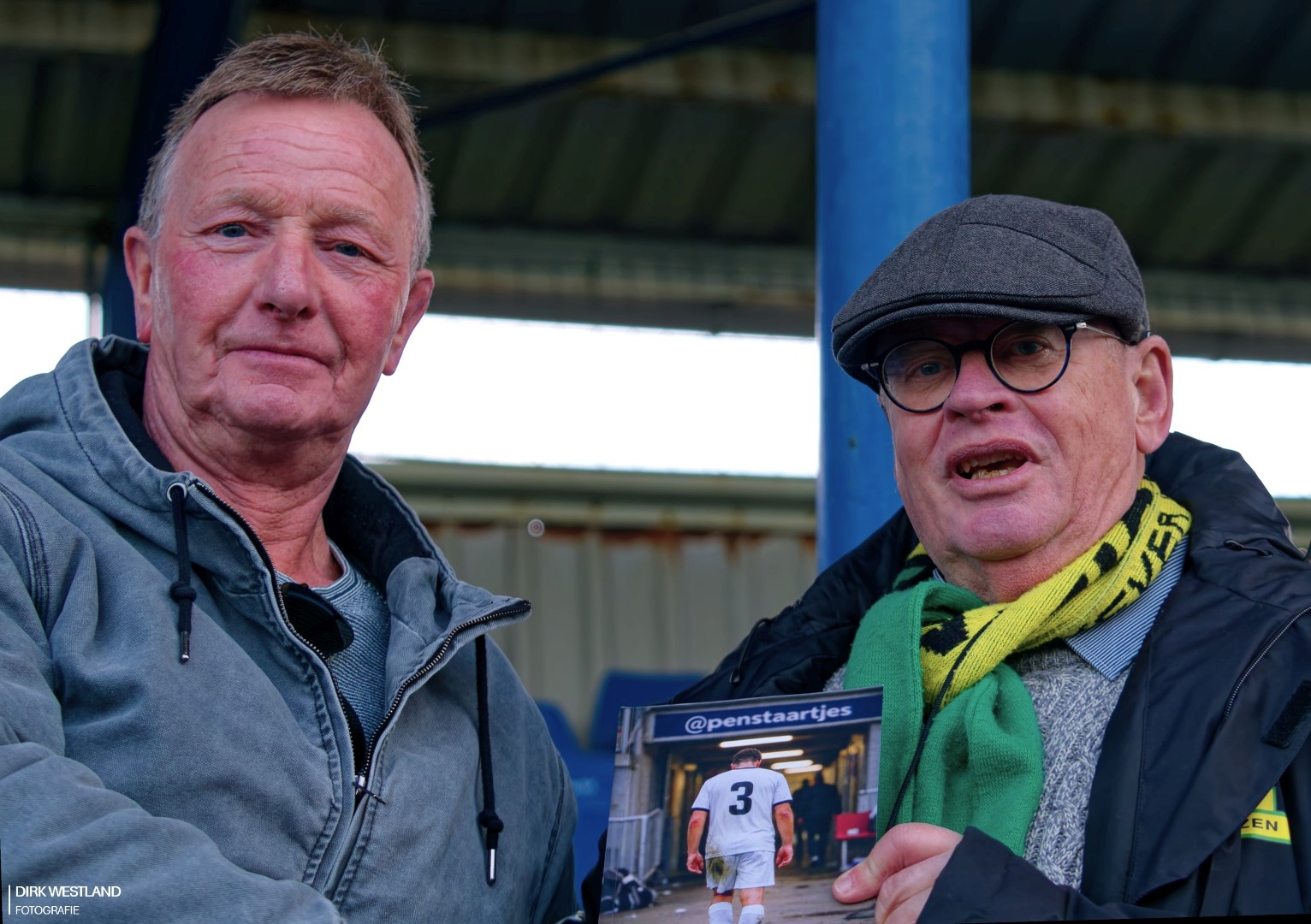 Ook een mooie gelegenheid om de eerste bestellingen van mijn laatste verzameling voetbalcolumns uit te leveren. Vorige week mocht ik al het eerste exemplaar aan mijn trouwe fan ‘De Schilder’ Fred ‘Scheidsie scheidsie!’ uitreiken. De foto ziet er niet uit, maar dat hoofd heb ik al mijn hele leven en veel beter gaat het denk ik toch niet meer worden. Dus toch hier maar even een plaatje van dat heugelijke feit. Schaamteloos neem ik de gelegenheid te baat om even reclame te maken: 75 prikkelende voetbalverhalen voor € 15,– Te bestellen bij mij persoonlijk. Zie het mailadres onder deze verslagen!