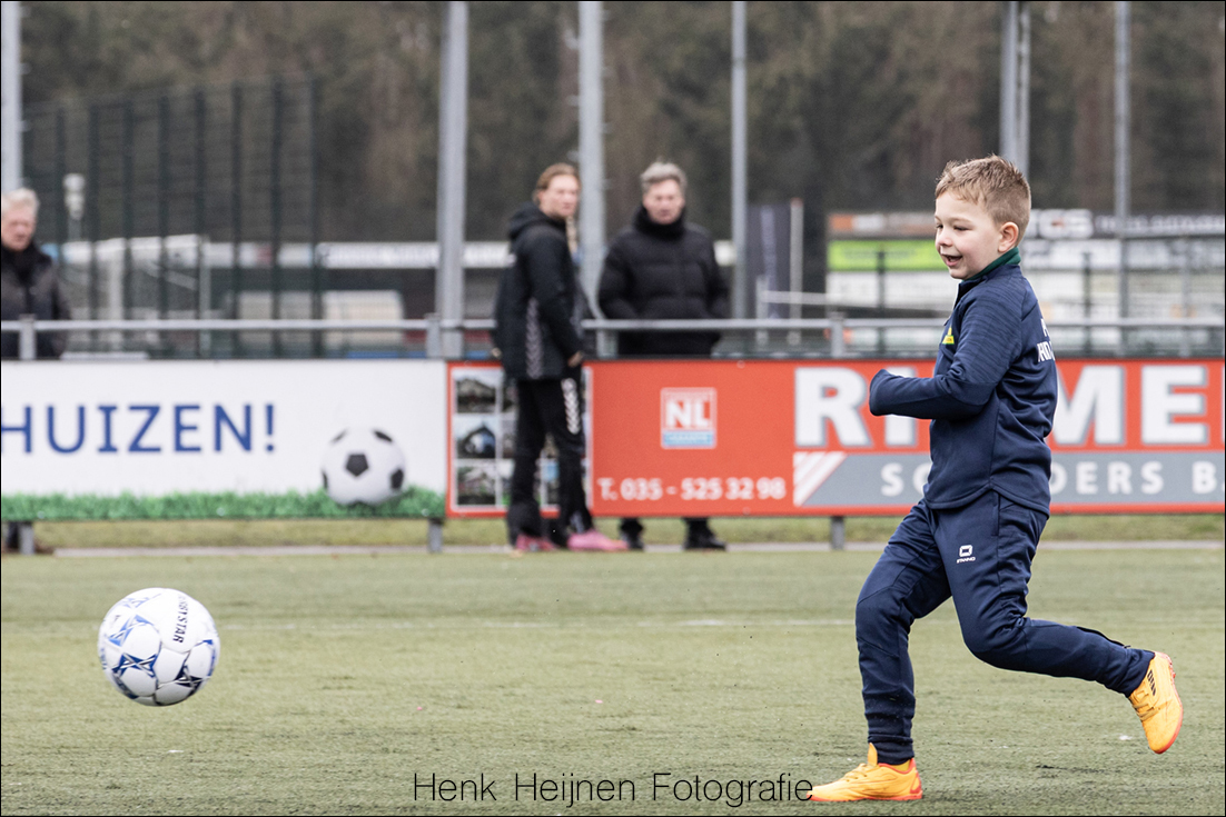 Nadat de pupil van de week de door de Businessclub Zuyderzee gesponsorde wedstrijdbal keurig achter doelman Thijs Terhalle heeft gedeponeerd ontstaat er een rommelige openingsfase. Beide ploegen spelen ‘gejaagd’ en dat werkt de slordigheden nadrukkelijk in de hand. De ballen blijven zelden meerdere passes bij dezelfde kleur. Het is Sergio Kozjak die voor het eerst blijk geeft van enige ‘kwaliteit’: een waanzinnig mooie pass over de diagonaal van het veld is precies op maat qua richting, timing en snelheid. Daar wordt Artuur Zutterman mee bereikt die zijn vertrouwde stek weer heeft ingenomen na zijn romantische Valentijns weekend Kopenhagen van vorige week. De voorzet van Zutterman is scherp en helaas net iets te hoog voor Tijmen Bakker die onder de bal door vliegt. Daarmee verrast hij denk ik Ahmed al Mahdi die de bal vervolgens niet weet te controleren.