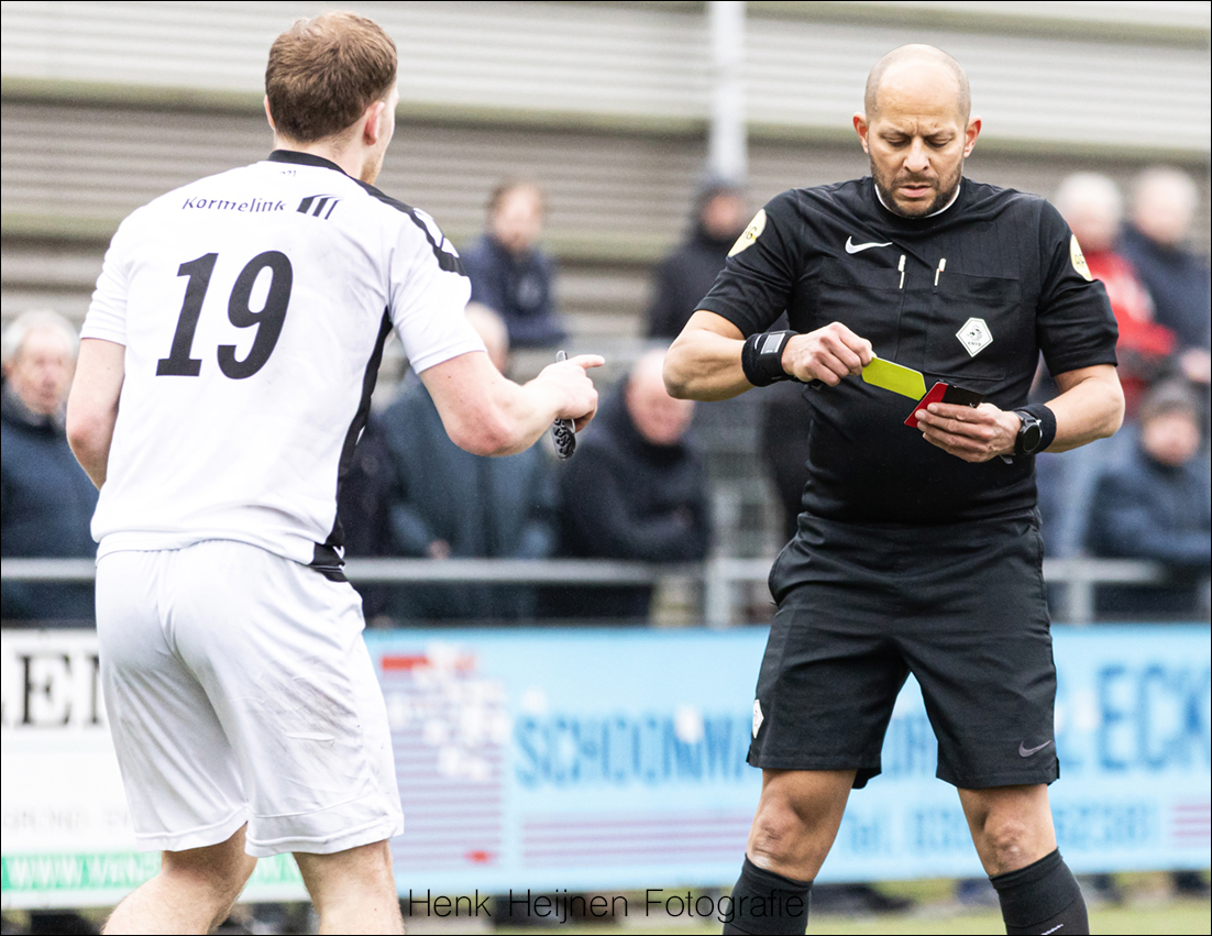 Invaller arbiter John Kraak kon ook terugzien op een goede wedstrijd. Toch ontkomt hij niet aan het trekken van geel als Ruben Radstake wat al te nadrukkelijk naar de noodrem grijpt wanneer Ahmed al Mahdi over de flank wil doorbreken.