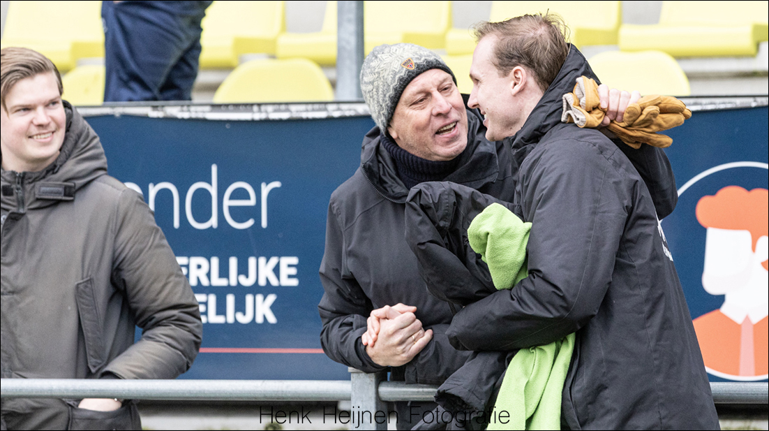 Het was inderdaad een lastiger wedstrijd dan strikt noodzakelijk. HSC’21 speelt in wezen eigenlijk nergens meer voor. Wij wel en hebben daardoor een soort van stress om te moeten presteren. Dat hebben we echt wel zo ervaren in ieder geval. We kwamen goed op 1 – 0 voor en dat was wel nodig ook. Maar dan doen we onszelf tekort door die score niet verder uit te breiden en dan zie je dat we toch weer onder druk komen te staan. Dan gaan we ineens duels verliezen, onnodig balverlies beginnen te lijden, het initiatief kwijtraken… En dan wordt het ineens toch een lastige pot! Die 2 – 0 was echt een bevrijding! Maar dat heeft veel te lang geduurd!”
