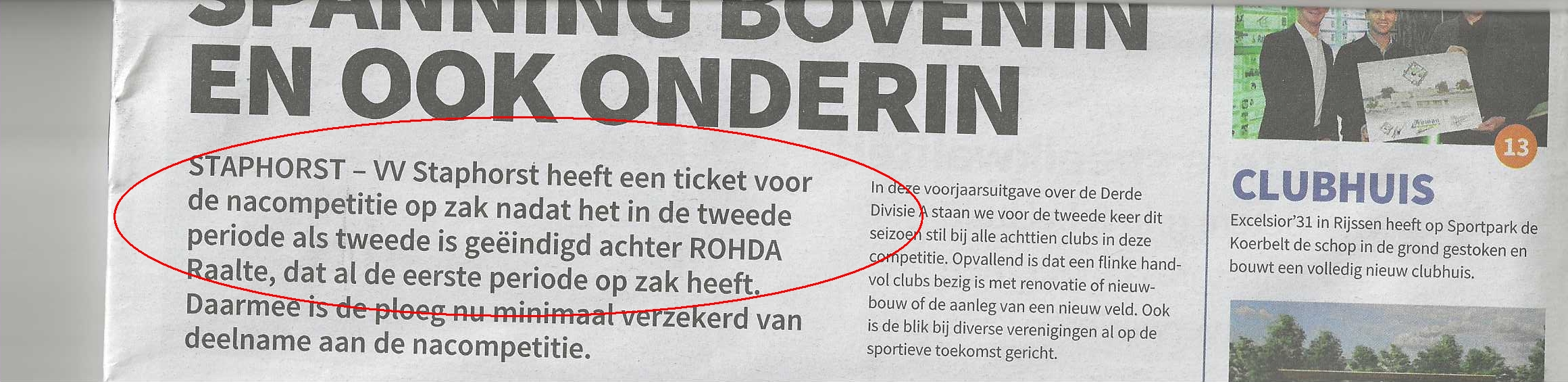 Om te beginnen moet ik mijn excuses maken voor de foutieve informatie die ik u voorafgaand een onze wedstrijd tegen Staphorst deed toekomen inzake het ‘uitgespeeld’ zijn van de Staphorsters. Ik vond ze al zo opmerkelijk fanatiek voor een team dat alleen nog voor des keizers baard zou spelen…
