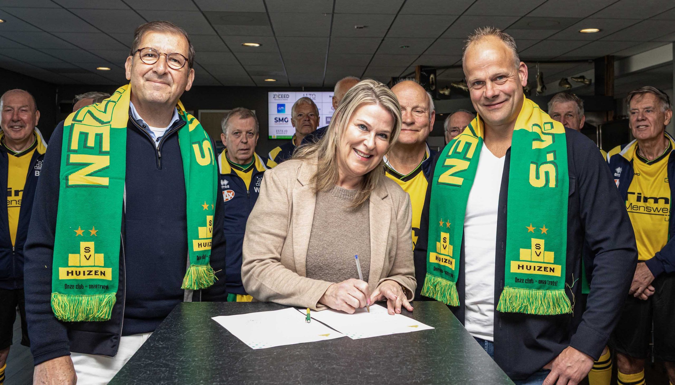 Voorafgaand aan de wedstrijden vond een ceremonieel sponsormoment plaats in de businessruimte van s.v. Huizen. Tim van Tim Men’s Wear uit Laren en zilversponsor Nico Klein, samen met zijn zoon Mark Klein van Nico en Alie Klein Vleeswarenspecialist uit Huizen, ondertekenden het sponsorcontract in aanwezigheid van Brenda Schipper, namens de secretaris van s.v. Huizen. Daarna werden de nieuwe shirts officieel overhandigd aan de spelers — die er stralend mee op de foto gingen.